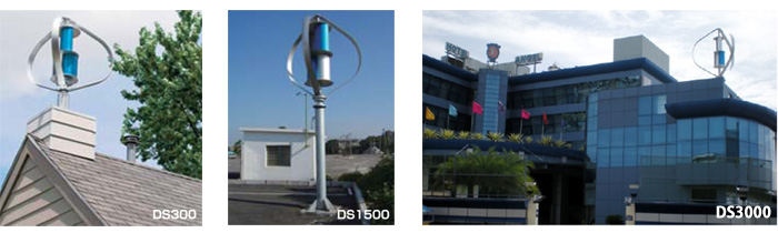 4 types in different sizes and capacity of Wind Turbine i.e. [DS300], [DS700], [DS1500], [DS3000] are lined up for various locations such as roof, outlet of ventilation etc.